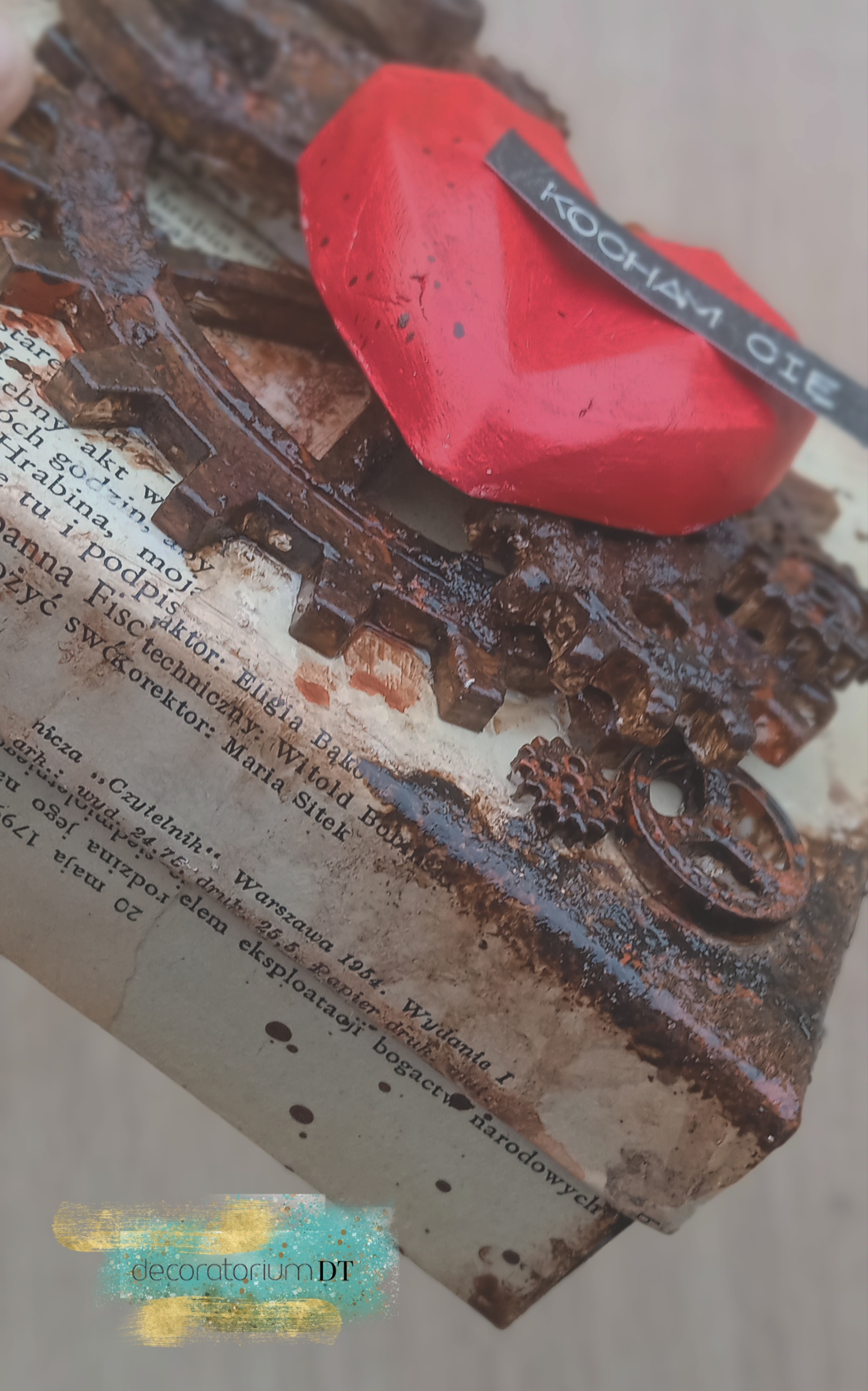 Za pomocą trzech fluidów starałam się uzyskać jak najlepszy efekt starej rdzy. Wszystko przykleiłam za pomocą Heavy Body Gel. Wisienką na torcie jest czerwone serducho, na które naniosłam fluid ale w kolorze czerwieni.